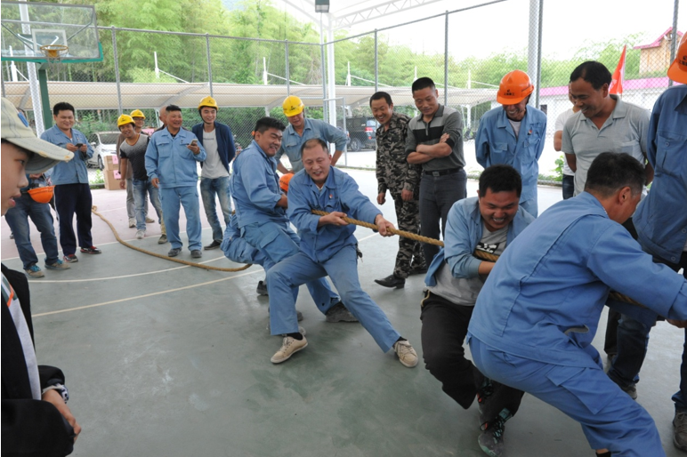 下午的拔河比賽以各部門為單位,共分采礦、頭破、一線、二線、固液、碼頭、科室、外協(xié)8個運動隊。通過抽簽分成每兩組進行淘汰賽,每組勝利隊進決賽分出最終冠軍、亞軍、季軍。賽場上,兩組隊員們口中一起高呼著“一二,一二”, 雙手緊握長繩,未參賽的員工自發(fā)組成啦啦隊為比賽隊員吶喊加油,吶喊聲此起彼伏,飄蕩在上空。拔河比賽由外協(xié)部門取得最終的勝利!