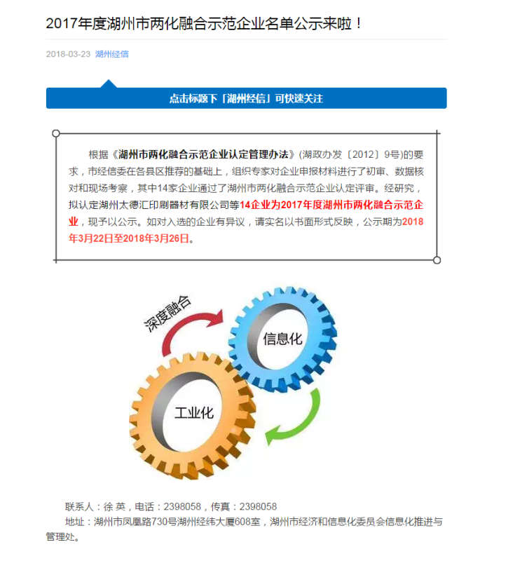新開元被評為2017年度湖州市兩化融合示范企業(yè)。